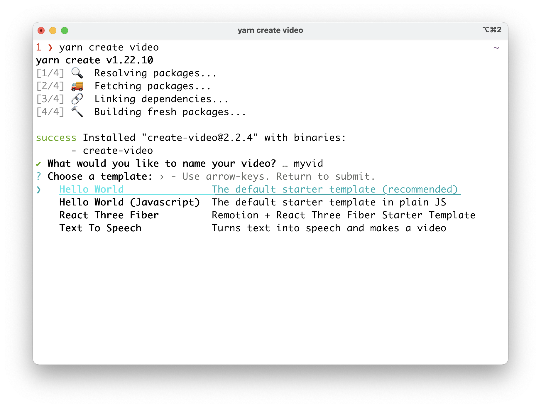 • npm init video will now setup a Remotion project with NPM, yarn create video will setup a project with Yarn.